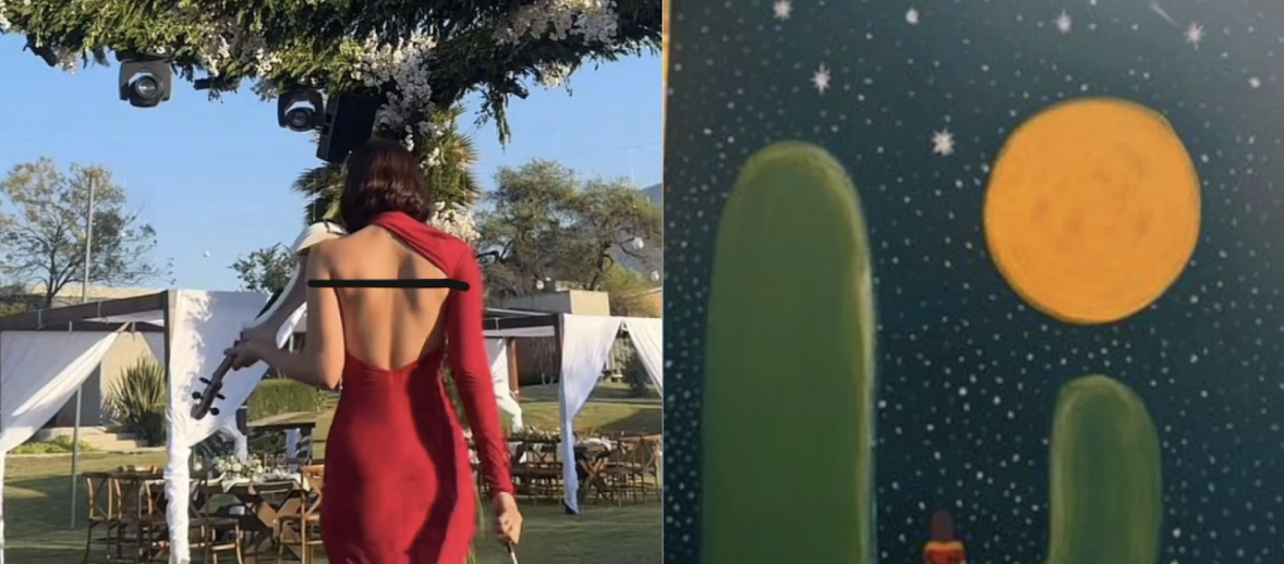 La pintura en cuestión de Christian Nodal retrata a una mujer vestida de rojo, sentada sobre un cactus y observando el cielo nocturno. En su momento, la imagen fue interpretada por seguidores como una representación simbólica de Ángela Aguilar, en un contexto en el que la pareja ya había hecho pública su relación.